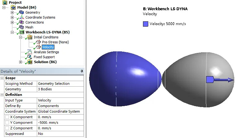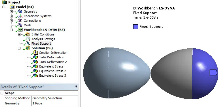 Set the right-side egg to be fixed. Right-click on “Workbench LS-DYNA,” add “Fixed Support,” and in the graphical interface, select the outer surface of the large end of the egg. Then, click “Apply” in the “Geometry” list below.