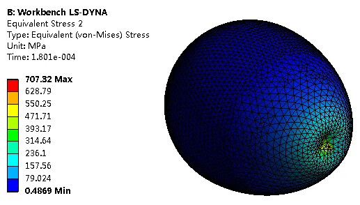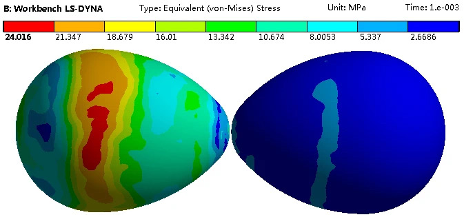 From the stress contour plots of the two eggs above, it can be observed that the maximum stress in the actively colliding egg on the left is 707.32 MPa, while the maximum stress in the egg being collided with on the right is 451.77 MPa. This indicates that the dynamic egg is more likely to fracture than the static egg!