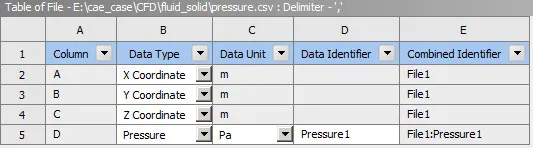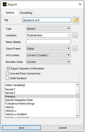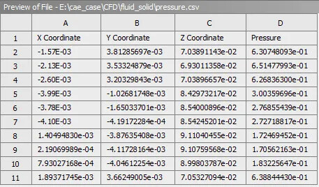 然后就可以通过CFD-Post中的Export导出功能,选择这个fluidinterface,然后将这个面上的Pressure导出为一个csv文件。那么这个文件中就会包含节点坐标值,和对应的压力值。