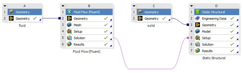 方法1中,比如可以在ANSYS Workbench中,使用Fluent计算完成后,可以将它的Solution连接到结构静力学模块的Setup中,就可以实现将流体壁面的压力值传递给结构模型,这是一个典型的单向流固耦合流程。