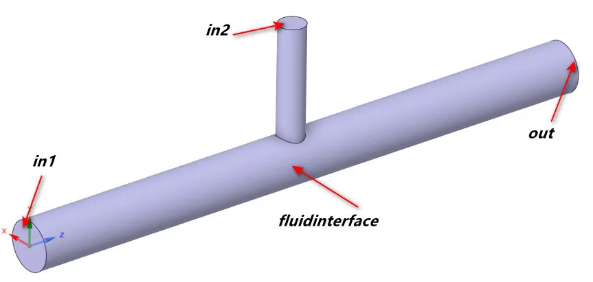 做好流体域的边界命名工作,包括两个入口(in1和in2)、一个出口(out),流体域和固体域的交界面(fluidinterface),在后处理中,就需要通过这个fluidinterface面,将这个面上的压力值传递给结构模型。