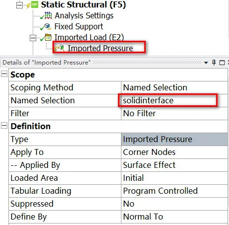 这样,就可以在结构静力学模块中,import压力值了。只需要设定接收外部数据的表面是solidinterface即可。