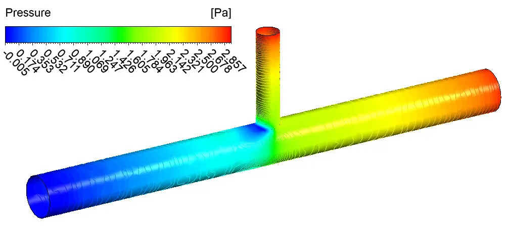 在fluent中,给两个入口分别设定一个流体的流速值,就可以计算得到流体域中,这个fluidinterface的压力分布云图。
