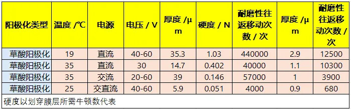 - 常温下草酸阳极化膜的耐磨性高于普通硫酸阳极化膜,不同工艺条件下数据如下: