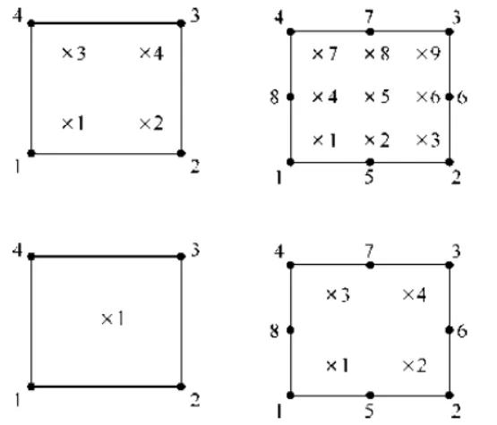 缩减积分的概念如图3所示,上图为完全积分,下图为缩减积分(注意在ANSYS软件中 ,Full Integration 实际是选择缩减积分,即将求解应变的矩阵分为体积项和偏差项,对体积项采用缩减积分,对偏差项采用完全积分)。此处所讲的缩减积分(Reduced Integration)是对体积项和偏差项均采用缩减积分。但该方法会出现沙漏(变形的零能模式)。