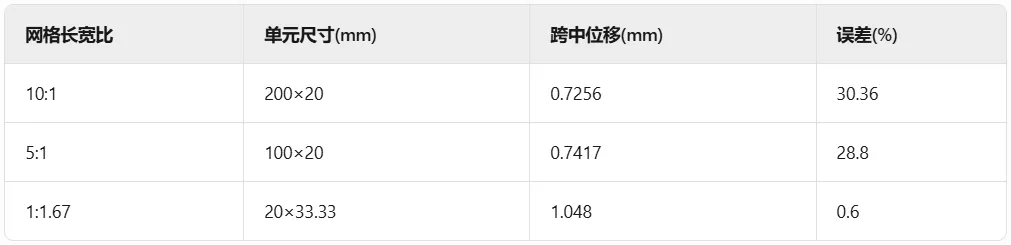值得注意的是,剪切自锁现象还受到单元长宽比的较大影响。如下表所示,有分析表明:当简支梁网格长宽比达到10:1(200mm×20mm单元)时,即使用缩减积分,跨中位移误差仍高达30%;而当采用近正方形单元(20mm×33.33mm)时,结果与理论解(1.042mm)基本吻合。