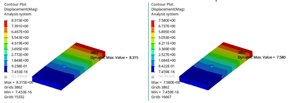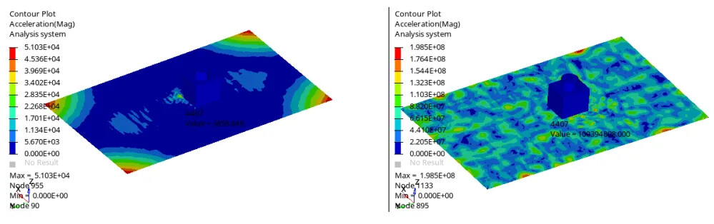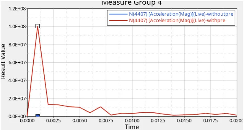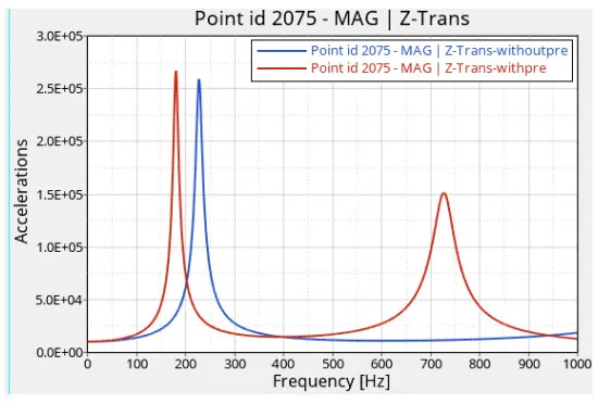 1、螺栓对性能的影响,如模态振动、冲击等影响,从下图中可以看出是否考虑施加螺栓预紧力,对性能影响较大,如图7所示。