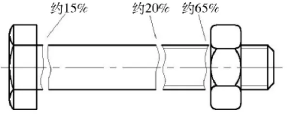 据统计螺栓连接的失效形式主要是螺栓杆部的损坏:在轴向变载荷的作用下,螺栓的失效多为螺栓的疲劳断裂,损坏的地方都是截面有剧烈变化因而有应力集中处。就破坏性质而言,约有 90% 的螺栓属于螺杆疲劳破坏。据统计资料表明,受变载荷的螺栓,如图 1,在从螺母支撑面算起第一圈或第二圈螺纹破坏处损坏的约占 65% ,在光杆与螺纹部分交界处损坏的约占 20% ,在螺栓头与杆交界处损坏的约占15% 。
