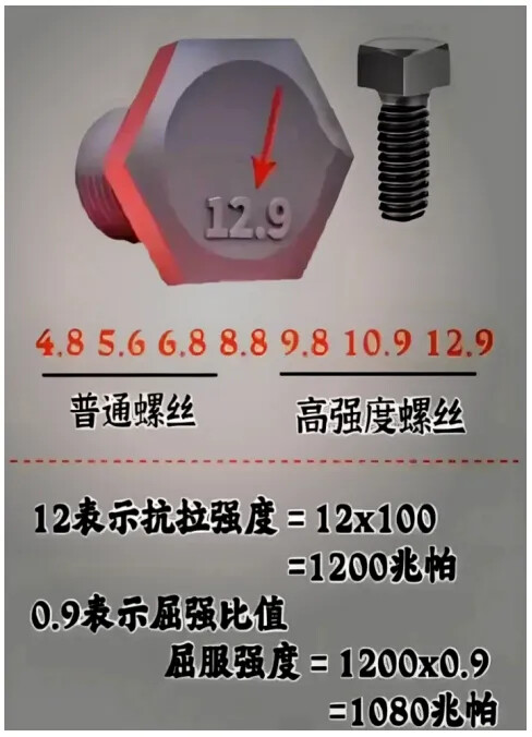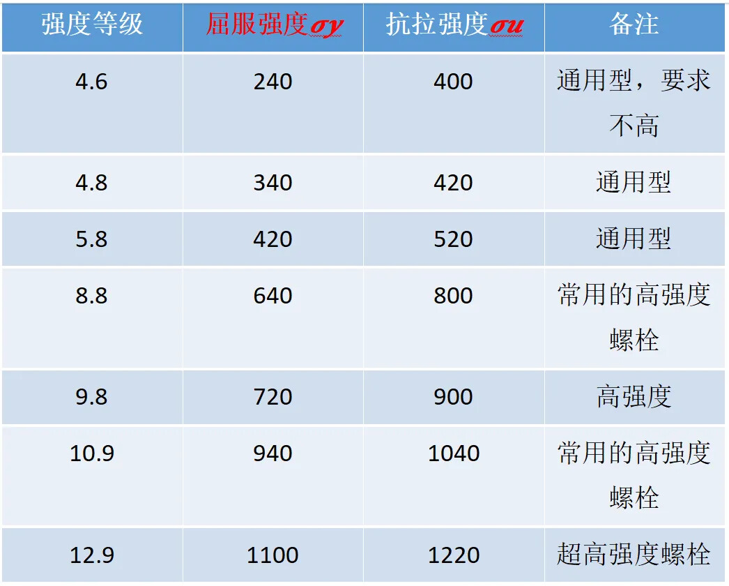 \sigma _{y}:螺栓材料的屈服强度。这个值由螺栓的强度等级决定。常见等级对应的屈服强度(\sigma _{y})和抗拉强度(\sigma _{u})见下表。