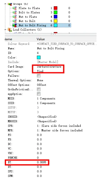 (2)在这个例子中,一个预加载的螺栓通过将螺母向下移动螺栓轴来夹紧两个板。螺栓和螺母使用0.5毫秒的绑扎接触锁定在一起。