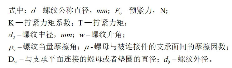 螺栓扭矩与螺栓载荷换算,依据经验公式:M=F\times D\times K (M为螺栓扭矩,F为螺栓载荷,D为螺栓公称直径,K为系数,一般为0.1-0.3,常取0.16,需根据实际进行相应调整)。