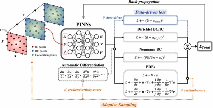 By simultaneously minimizing these two loss terms, PINNs can maintain data consistency while adhering to the physical constraints implied by the governing equations, resulting in more reasonable and generalizable solutions. Thanks to this, PINNs excel in solving problems that traditional numerical methods struggle with. PINNs have been applied in various fields such as fluid mechanics, heat transfer, solid mechanics, quantum mechanics, and materials science, offering high-precision solutions for forward problems and unique advantages in inverse problems and parameter identification.