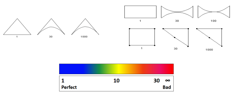 - Jacobian Ratio。 该比值基于雅可比矩阵的行列式,在有限元分析中,雅可比矩阵用于将单元矩阵从理论形状(如完全平方、三角形)转换为实际形状。理想单元的雅可比矩阵比为1,该值离1越远,该单元网格质量也越差。