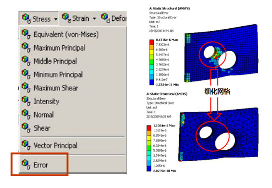 - 查看能量误差结果。 能量误差显示节点上因应力不匹配而产生的能量。实际数字应该定性地处理,而不是定量地处理。这个结果是个相对值,色差明显的区域表明此处网格不够精确,如果发生在高应力区域,有必要通过加密网格来获得更准确的答案。