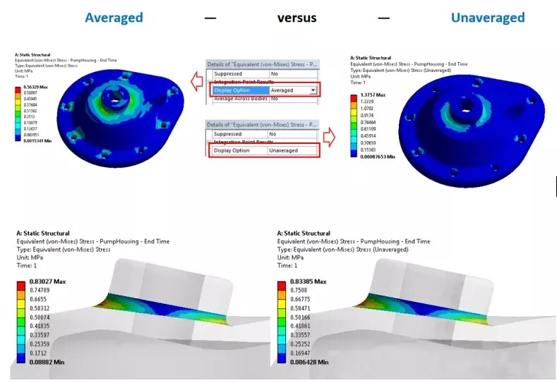 - 查看未平均的结果。 未平均的结果在节点处计算每个单元的应力值。每个单元在节点处计算的值会有所不同,从而导致节点周围的应力分布不均匀。有限元软件通常在节点处平均应力,以呈现光滑的应力云图,但这也不可避免隐藏应力的不连续性。粗网格比细网格有更高的应力差异,因此绘制非平均应力可以帮助用户识别网格细化的候选区域,还可以帮助你评估应力是否由于网格的原因导致被低估。