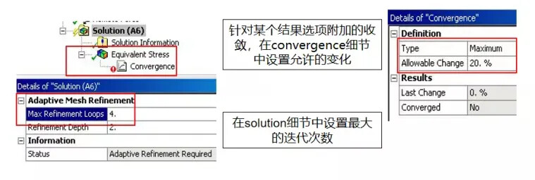 - 网格收敛性研究。 从理论上讲,模型中使用的单元越多,计算结果越接近实际值。如果用户对网格进行细化并求解修正后的模型,经过多次迭代后,结果将趋向于稳定,这就是所谓的网格收敛。ANSYS中可针对指定的结果进行收敛性研究,但是这种方法可能由于产生密集的网格而导致非常耗时,并可能受计算机硬件的限制而无法计算。在这种情况下,最好工程师自己指定网格密度,并关注感兴趣的区域。