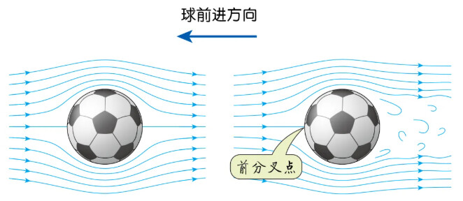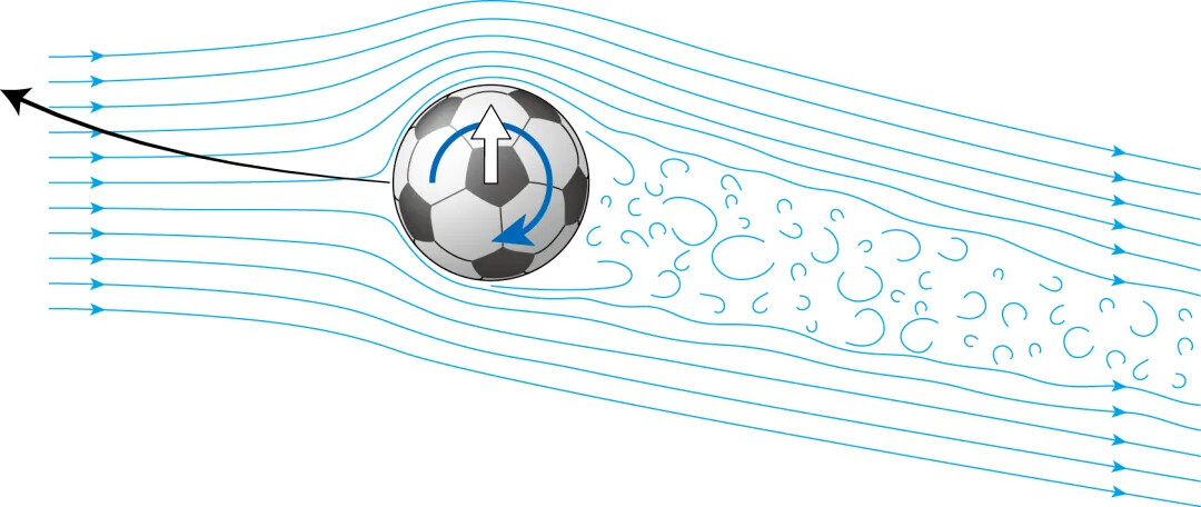当旋转着的足球在空中飞行时,会带动其表面的空气薄层(即边界层)同时旋转,其一侧的空气薄层逆着来流转动,对来流形成阻碍,使来流减速;另一侧的空气薄层顺着气流转动,使来流加速。所以,球两侧的气流速度变得不同。根据伯努利原理可知,空气流速度大的一侧会形成一个低压区,空气流速度小的一侧会形成一个高压区。足球受到横向压差力的作用,使球偏离原直线运动方向。