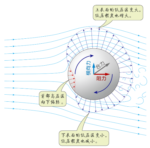一种解释是旋转的球两侧的压力分布不对称,一侧压力低,另一侧压力高,从而产生横向力。