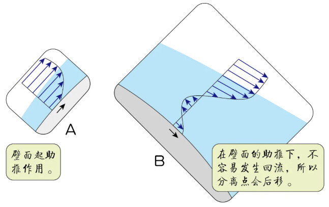 上侧的分离点由于壁面对气流的助推作用而延后,下侧的分离点由于壁面对气流的阻碍作用而提前。
