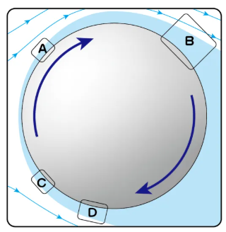 气流绕旋转的圆球流动所形成的壁面边界层有其特殊性,因为紧挨壁面的流体速度不再是零,而是和壁面具有同样的速度。对于图中所示的转动方向来说,上侧的壁面运动与流动方向相同,只要不发生分离,边界层内的速度就都是同方向的(A);下侧的壁面运动与流动方向相反,即使没有分离,紧挨壁面的流体速度也是与主流方向相反的(C)。
