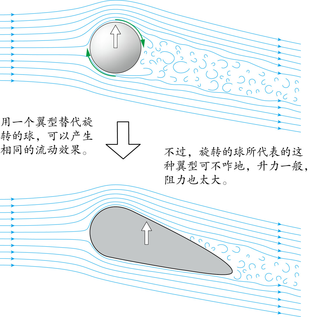 产生两侧压差力的是边界层之外的不受粘性影响的气流,这部分气流其实并不“知道”球是否在旋转,它们感受到的只是物体的虚拟形状,这个虚拟形状类似于机翼,决定了横向力的产生。