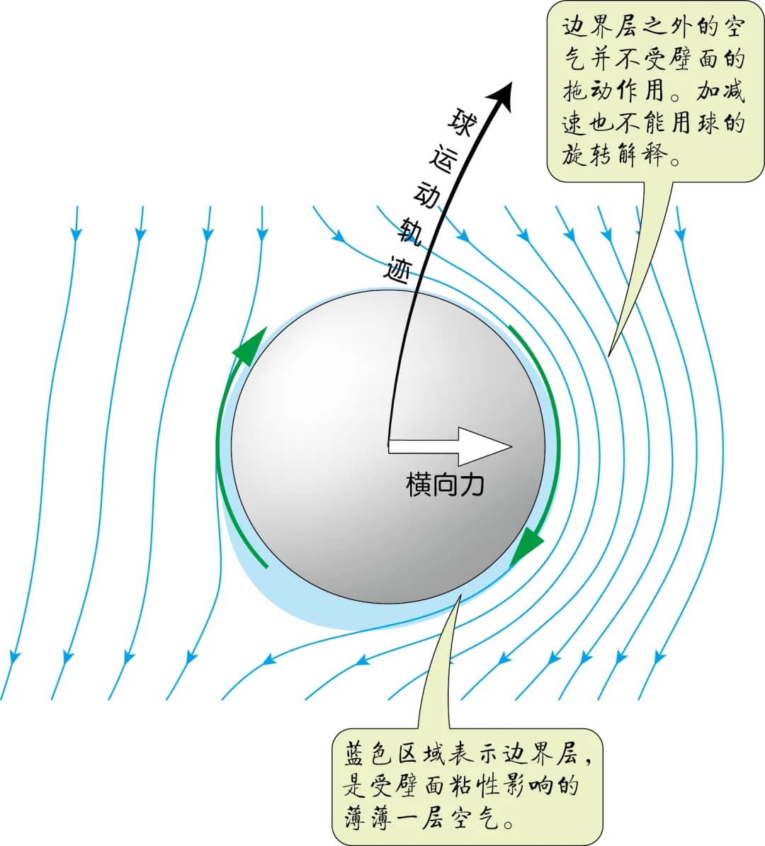 上面的解释中,说旋转的球带动表面的空气旋转,使流过球两侧的空气速度不同,这个说法本身也不能算完全错误,只是这种两侧速度不同并不是直接由球表面拖动产生的。