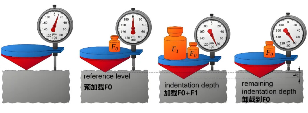 施加试验力F1,叠加预紧力F0,总压力F=F0+F1,压入材料。