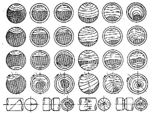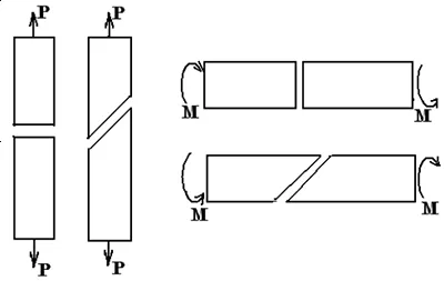 - 正向断裂:断裂表面与轴向成45°角,即沿最大正应力作用的平面发生的断裂。单向脉动扭转时为螺旋状;双向扭转时,其断裂面呈星状;应力集中较大的呈锯齿状。