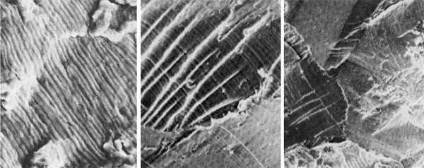 疲劳断口微观形貌的基本特征是,在电子显微镜下观察到的条状花样,通常称为疲劳条痕、疲劳条带、疲劳辉纹等。疲劳辉纹是具有一定间距的、垂直于裂纹扩展方向、明暗相交且互相平行的条状花样。