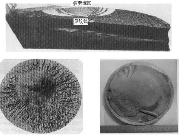 拉压疲劳断裂最典型的例子是各种蒸汽锤的活塞杆在使用中发生的疲劳断裂。在通常情况下,拉压疲劳断裂的疲劳核心多源于表面而不是内部,这一点与静载拉伸断裂时不同。但当构件内部存在有明显的缺陷时,疲劳初裂纹将起源于缺陷处。此时,在断口上将出现两个明显的不同区域,一是光亮的圆形疲劳区(疲劳核心在此中心附近);二是瞬时断裂区。在疲劳区内一般看不到疲劳弧线,而在瞬时断裂区具有明显的放射花样。