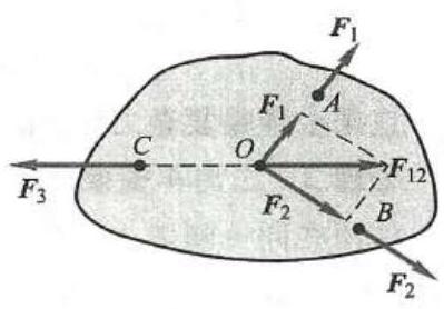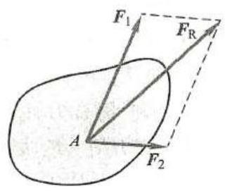 作用在物体上同一点的两个力,可以合成为一个合力,合力的作用点也在该点,合力的大小和方向,由这两个力为边构成的平行四边形的对角线确定,如图 1 所示。合力矢等于这两个力矢的几何和,即