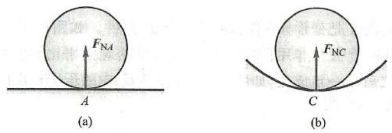 这类约束不能限制物体沿约束表面切线方向的位移,只能阻碍物体沿接触表面法线方向并指向约束内部的位移。因此,光滑支承面对物体的约束力,作用在接触点处,方向沿接触表面的公法线,并指向被约束的物体。这种约束力称为法向约束力,通常用 {\mathbf{F}}_{\mathrm{N}} 表示,如图 5 中的 {\mathbf{F}}_{\mathrm{N}A} 、 {\mathbf{F}}_{\mathrm{N}C} 和图 6 中的 {\mathbf{F}}_{\mathrm{N}B} 等。