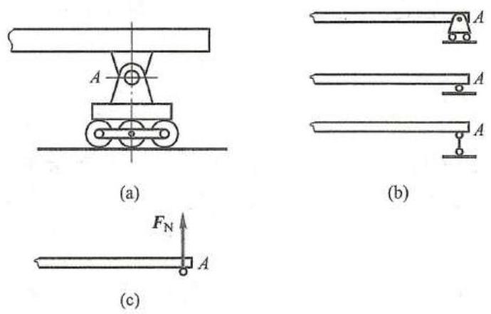 在桥梁、屋架等结构中经常采用滚动支座,这种支座是在固定铰链支座与光滑支承面之间,装有几个滚轴而构成,又称为滚轴支座,如图 11a 所示,其简图如图 11b 所示。它可以沿支承面移动,允许由于温度变化而引起结构跨度的自由伸长或缩短。显然,滚动支座的约束性质与光滑面约束相同,其约束力必垂直于支承面,且通过铰链中心。通常用 {\mathbf{F}}_{\mathrm{N}} 表示其法向约束力,如图 11c 所示。在某些实际工程结构中,滚轴支座除了底面有光滑支承面以外,上面可能还设有盖板,以防支座翘起。 因此,滚动支座的约束力方向也可能指向支承面。