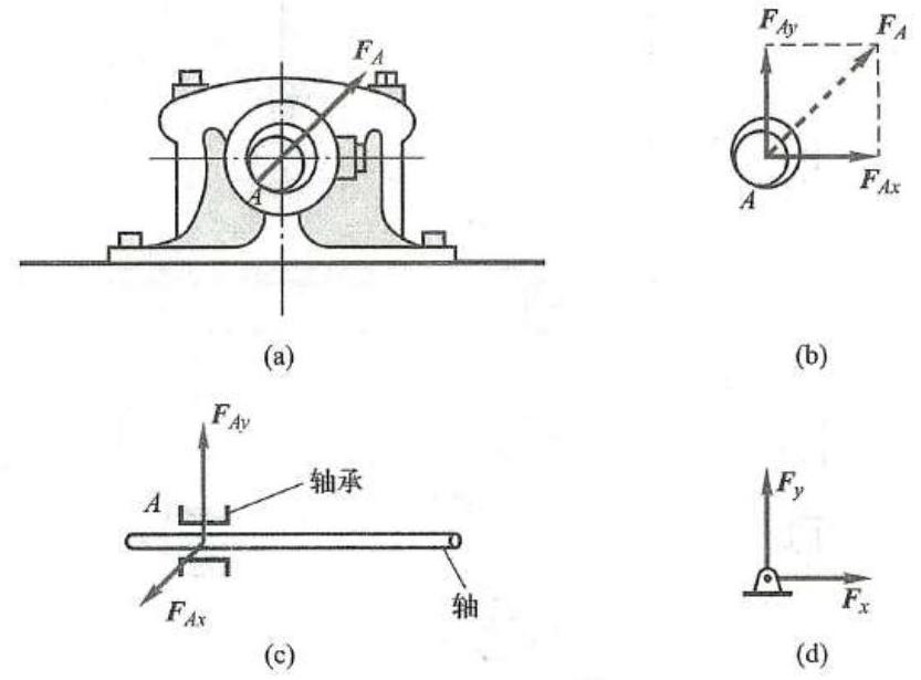 上述三种约束 (向心轴承、圆柱铰链和固定铰链支座),它们的具体结构虽然不同,但是构成约束的性质是相同的,一般通称为铰链约束,通常用图 9d 所示的符号表示。此类约束的特点是只限制两物体径向的相对移动,而不限制两物体绕铰链中心的相对转动与沿轴向的位移。此类约束的约束力一般用两个正交分力来表示,如图 9d 所示。