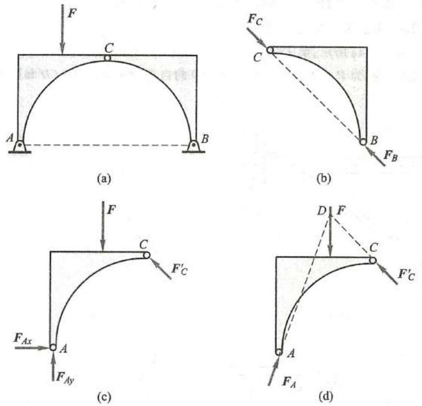 再进一步分析可知,由于拱 {AC} 在 F\text{、}{F}_{C}^{\prime } 及 {F}_{A} 三个力作用下平衡,故可根据三力平衡汇交定理,确定铰链 A 处约束力 {\mathbf{F}}_{A} 的方向。点 D 为力 \mathbf{F} 和 {\mathbf{F}}_{C}^{\prime } 作用线的交点,当拱 {AC} 平衡时,约束力 {\mathbf{F}}_{A} 的作用线必通过点 D (图 15d); 至于 {\mathbf{F}}_{A} 的指向,暂且假定如图所示,以后由平衡条件确定。