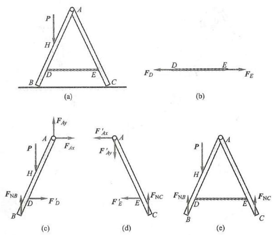 (4)画梯子整体的受力图。在画系统(梯子)的整体受力图时,{AB} 与 {AC} 两部分在 A 处相互有力作用,在点 D 与点 E 绳子对其也有力作用,这些力成对地作用在系统内。系统内各物体之间相互作用的力称为内力,内力是成对出现的,对系统的作用效应相互抵消,因此,在受力图上一般不画出。在受力图上只画出系统以外的物体对系统的作用力,这种力称为外力。这里,人的重力 \mathbf{P} 和地板约束力 {\mathbf{F}}_{NB}\text{、}{\mathbf{F}}_{NC} 是作用于系统上的外力,整个系统 (梯子) 的受力图如图 16e 所示。