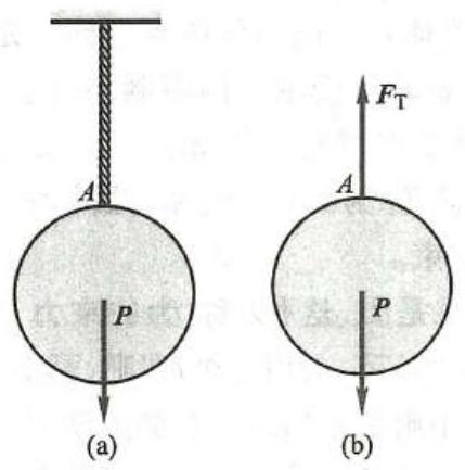 绳索吊住重物,如图 7a 所示。因为柔软的绳索本身只能承受拉力,所以它给物体的约束力也只可能是拉力 (图 7b)。因此,绳索对物体的约束力,作用在接触点,方向沿着绳索背离物体。通常用 \mathbf{F} 或 {\mathbf{F}}_{\mathrm{T}} 表示这类约束力。