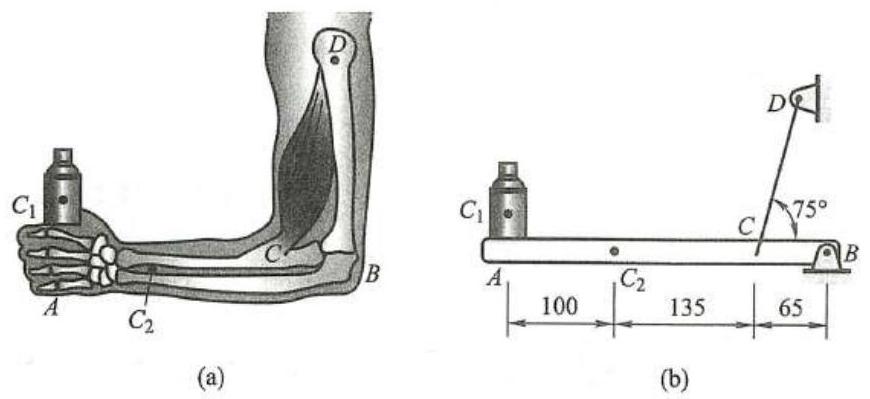 如图 23a 所示,人的胳膊呈 90° 手握一重物,其重心位于点 {C}_{1} ,小臂重心位于点 {C}_{2} ,重量均为已知。小臂骨可抽象为一直杆,骨关节 B 处可抽象为一铰链,肌肉 {CD} 可视为一柔索(或拉杆),则抽象出的力学模型如图 23b 所示。给出载荷和尺寸就可计算肌肉 {CD} 与骨关节 B 处的受力。