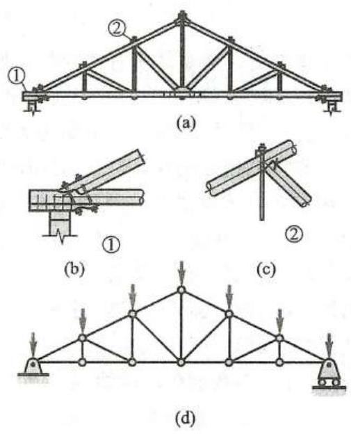 图 21d 所示就是图 21a 所示实际屋架简化的力学模型,计算图 21a 所示实际屋架的受力,就是通过计算图 21d 所示的力学模型来完成的。