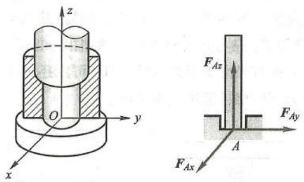 轴可在孔内任意转动,也可沿孔的中心线移动; 但是,轴承阻碍着轴沿径向向外的位移。当轴和轴承在某点 A 光滑接触时,轴承对轴的约束力 {\mathbf{F}}_{A} 作用在接触点 A ,且沿公法线指向轴心 (图 9a)。