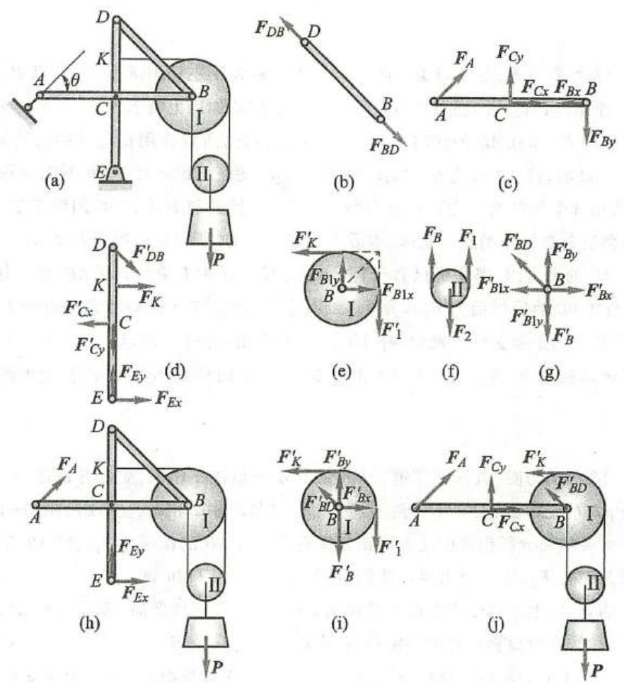 此例中铰链 B 连接有杆 {DB} 、杆 {AB} 、滑轮 \mathrm{I} 和钢丝绳四个构件,因此,在将各构件在 B 处分离时必须明确销的位置。