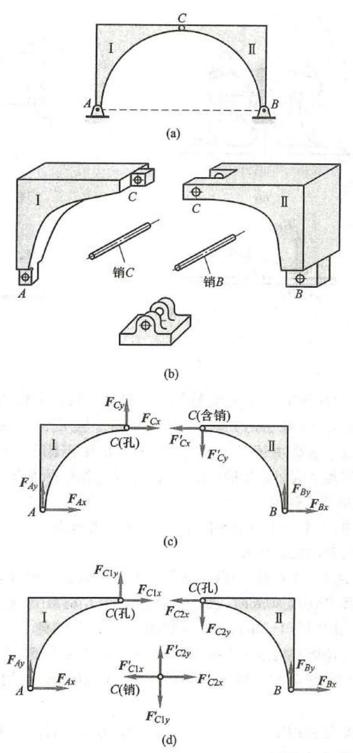 图 10a 所示为一拱形桥示意图,它是由两个拱形构件通过圆柱铰链 C 以及固定铰链支座 A 和 B 连接而成的。圆柱铰链是由销 C 将两个钻有同样大小孔的构件连接在一起而成的 (图 10b),其简图如图 10a 的铰链 C 所示。如果铰链连接中有一个固定在地面或机架上作为支座,则这种约束称为固定铰链支座,简称固定铰支,如图 10b 所示的支座 B ,其简图如图 10a 所示的固定铰链支座 A 和 B 。