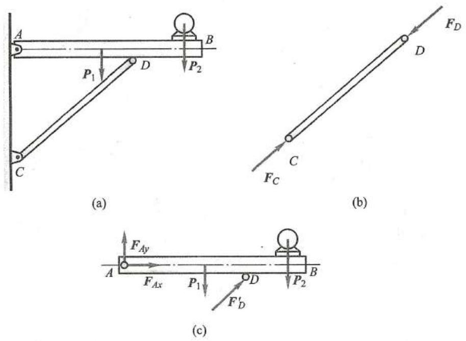 例 1 如图 14a 所示,梁 {AB} 用杆 {CD} 支承,A\text{、}C\text{、}D 三处均为光滑铰链连接。均质梁 {AB} 重为 {P}_{1} ,其上放置一重为 {P}_{2} 的电动机。不计杆 {CD} 的自重,分别画出杆 {CD} 和梁 {AB} (包括电动机) 的受力图。