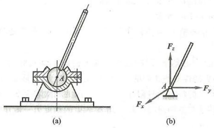 通过球和球壳将两个构件连接在一起的约束称为球铰链,如图 12a 所示。 它使构件的球心不能有任何位移,但构件可绕球心任意转动。若忽略摩擦,其约束力应是通过接触点与球心,但方向不能预先确定的一个空间法向约束力,一般用三个正交分力 {\mathbf{F}}_{x}\text{、}{\mathbf{F}}_{y}\text{、}{\mathbf{F}}_{z} 表示,其简图及约束力如图 12b 所示。
