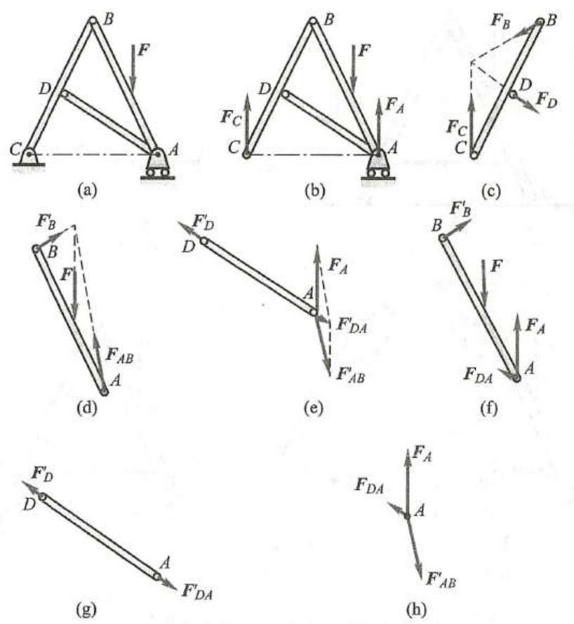 以上是将点 A 的销放置在杆 {AD} 上时,各构件受力图的画法。也可将销放置在杆 {AB} 上,此时画出的杆 {AB} 和杆 {AD} 的受力图结果有所不同,但整体和杆 {BC} 的受力图是一样的,此处不再重复。