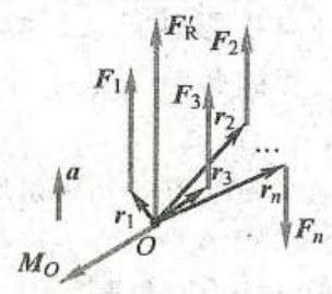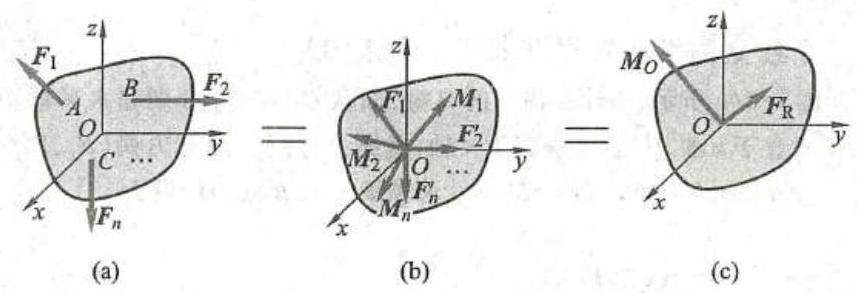 设刚体上作用有 n 个力 {\mathbf{F}}_{1},{\mathbf{F}}_{2},\cdots ,{\mathbf{F}}_{n} ,形成一空间任意力系,如图 15a 所示。与平面任意力系的简化方法一样,任取一点以 O 表示,称之为简化中心。应用力的平移定理,依次将作用于刚体上的每个力向简化中心 O 平移,同时附加一个相应的力偶, 和平面力系不同的是, 力偶矩以矢量表示。这样, 原来的空间任意力系被空间汇交力系和空间力偶系两个简单力系等效替换, 如图 15b 所示。其中,各力 {\mathbf{F}}_{i}^{\prime } = {\mathbf{F}}_{i} ,各力偶矩矢等于各分力对点 O 的力矩矢,即