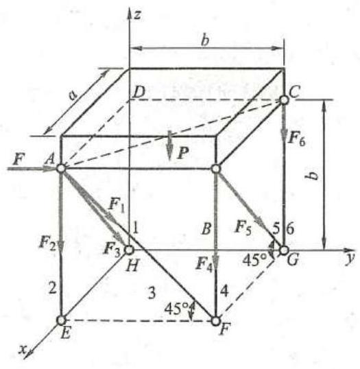 \sum {M}_{EA} = 0,\;{F}_{5}\cos {45}^{ \circ } \cdot b = 0,\;\text{得}{F}_{5} = 0\sum {M}_{FB} = 0,\; - {F}_{1}\cos {45}^{ \circ } \cdot b = 0,\;\text{ 得 }\;{F}_{1} = 0\sum {M}_{AC} = 0,\;{F}_{4} \cdot \frac{ab}{\sqrt{{a}^{2} + {b}^{2}}} = 0,\;\text{ 得 }\;{F}_{4} = 0\sum {M}_{AB} = 0,\; - {F}_{6} \cdot a - P \cdot \frac{a}{2} = 0,\;\text{ 得 }\;{F}_{6} = - \frac{P}{2}\text{ (压力) }\sum {M}_{HD} = 0,\;{F}_{3}\cos {45}^{ \circ } \cdot a + F \cdot a = 0\text{,得}{F}_{3} = - 2\sqrt{2}P\text{(压力)}\sum {M}_{CB} = 0,\;{F}_{2} \cdot b + P \cdot \frac{b}{2} + {F}_{3}\sin {45}^{ \circ } \cdot b = 0\text{,得}{F}_{2} = {1.5P}\text{(拉力)}