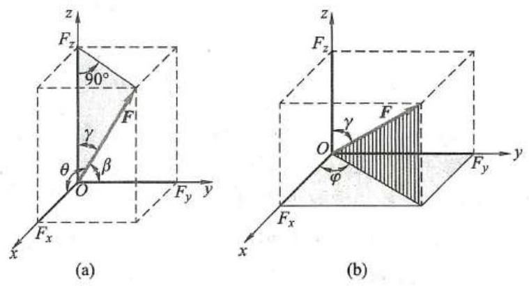 称此为直接 (一次) 投影法。当力 F 与 x\text{、}y 轴间的夹角未知或不易确定,但已知图 1b 所示角度 \gamma \text{、}\varphi 时,可采用间接 (二次) 投影法,如图 1b 所示,为