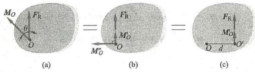 将主矩 {\mathbf{M}}_{0} 进行分解,得到平行于主矢的分量 {\mathbf{M}}_{0}^{\prime } 和垂直于主矢的分量 {\mathbf{M}}_{0}^{\prime \prime } ,如图 21d 所示,二者分别为
