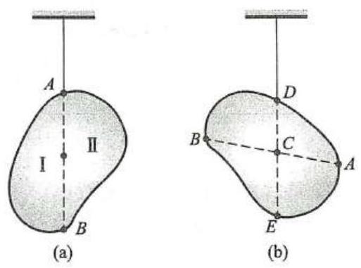 对于薄板形物体或具有对称面的薄零件,可将该物体悬挂于任一点 A ,如图 29a 所示。待平衡时,设法标出线段 {AB} ,据二力平衡条件,重心必在此线上。 再将该物体悬挂于任一点 D (图 29b),待平衡时,设法标出线段 {DE} ,则两线段的交点 C 就是该物体的重心。